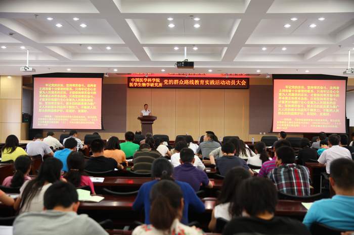 2013年7月24日下午16:00,中国医学科学院医学生物学研究所党的群众路线教育实践活动动员大会在生物所九楼报告厅隆重召开。中国医学科学院北京协和医学院院校党委书记李立明、云南省卫生厅党的群众路线教育实践活动督导组领导、生物所所领导班子成员、中层干部、各级人大代表、民主党派代表、全体在职共产党员、学生党员、离退休党支部书记180余人参加了本次大会。
