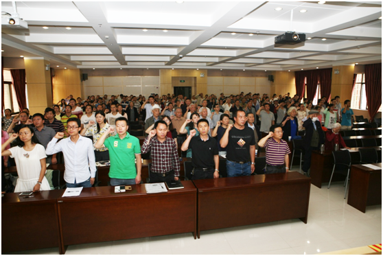 首先新党员杨耀云、唐成丽、郭自全、李仕成、龙琼、阮丽桃、蒋蕊鞠上台宣誓,党办主任吴俊带领全体党员重温了入党誓词。