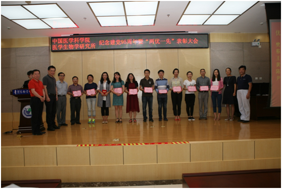 董少忠副所长宣读中国医学科学院医学生物学研究所党委关于表彰“先进基层党组织”、“优秀共产党员”和“优秀党务工作者”的决定?;竦帽碚玫募?、个人分别上台,由所领导和党委委员为他们颁发荣誉证书。所领导在发言中指出,希望受到表彰的先进集体和优秀个人再接再厉,在生物所改革发展的具体工作中取得新进步、展现新作为、再创新业绩。