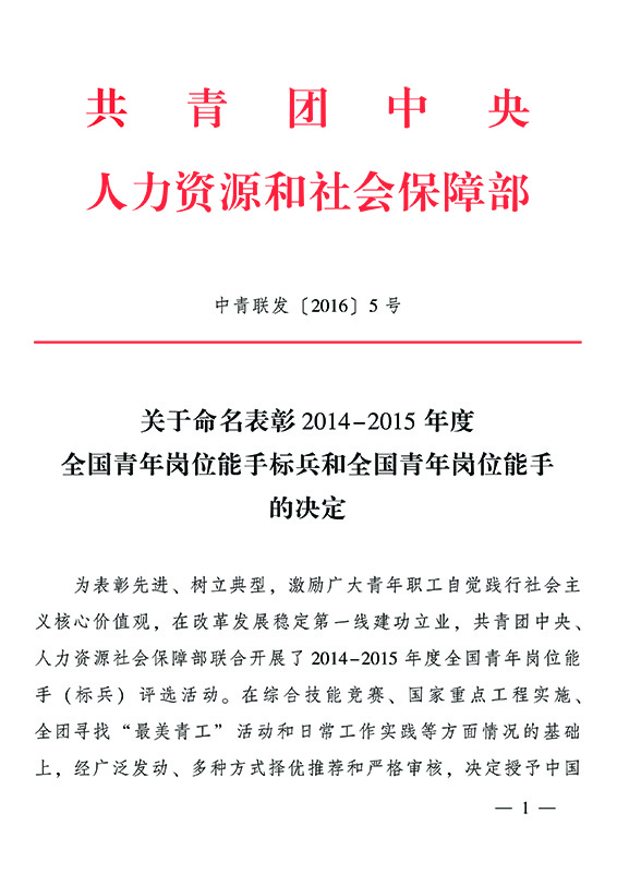 近日,由共青团中央、人力资源和社会保障部共同组织开展的2014—2015年度 “全国青年岗位能手”评选揭晓,我院寸韡同志荣获“全国青年岗位能手标兵”称号,全国仅31人获奖。