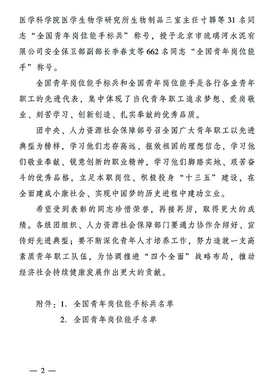“全国青年岗位能手标兵”和“全国青年岗位能手”是各行各业青年职工的先进代表,集中体现了当代青年职工追求梦想、爱岗敬业、刻苦学习、创新创造、扎实奉献的优秀品质,经广泛发动、多种方式择优推荐和严格审核等阶段,2014-2015年度共评选出“全国青年岗位能手标兵”31人、“全国青年岗位能手”662人。团中央、人力资源社会保障部号召全国广大青年职工以先进典型为榜样, 学习他们志存高远、报效祖国的理想信念, 学习他们敬业奉献、锐意创新的职业精神,学习他们脚踏实地、艰苦奋斗的优秀品格, 立足本职岗位,积极投身“十三五”建设, 在全面建成小康社会,实现中国梦的历史进程中建功立业。