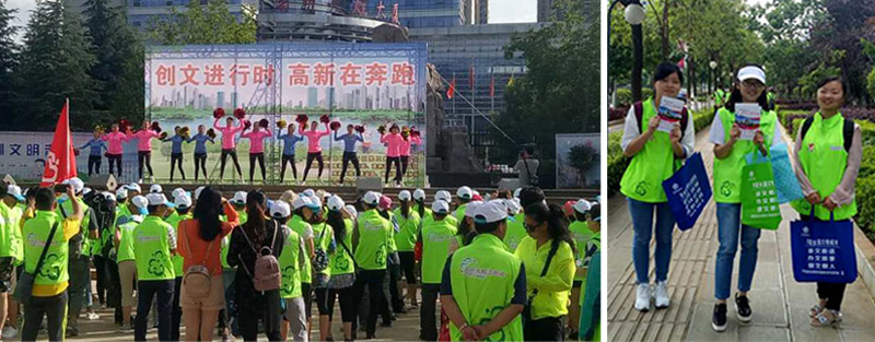 为进一步提高我市群众对昆明市“创文”工作的知晓率和参与率,提高志愿服务工作影响力、 知晓度和认同度,积极营造创建全国文明城市“ 人人参与、人人奉献、 人人共享”的浓厚氛围, 2017 年 6 月 3 日上午,由昆明高新区党工委、管委会主办的创建全国文明城市志愿服务活动在高新区时代广场隆重举行。