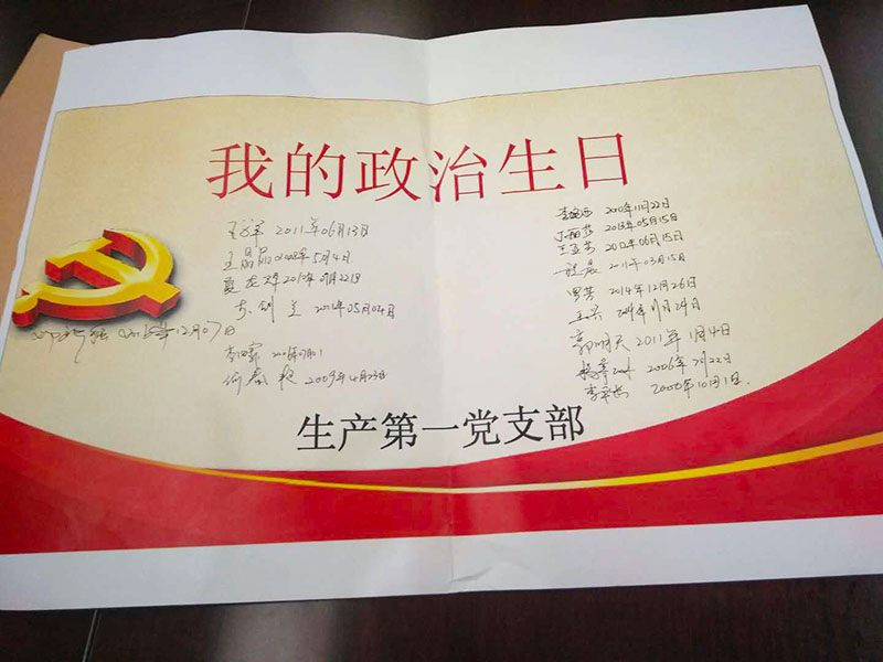 “政治生日”,就是在潜移默化中教育引导广大党员强化党的意识、党员意识、规矩意识、责任意识和宗旨意识,使党员常受教育,永葆先进性。彭正华同志给生产一支部全体党员过了一个有意义的“政治生日”。和所有党员集体谈心谈话,集体签名,并赠送“政治生日”纪念卡。