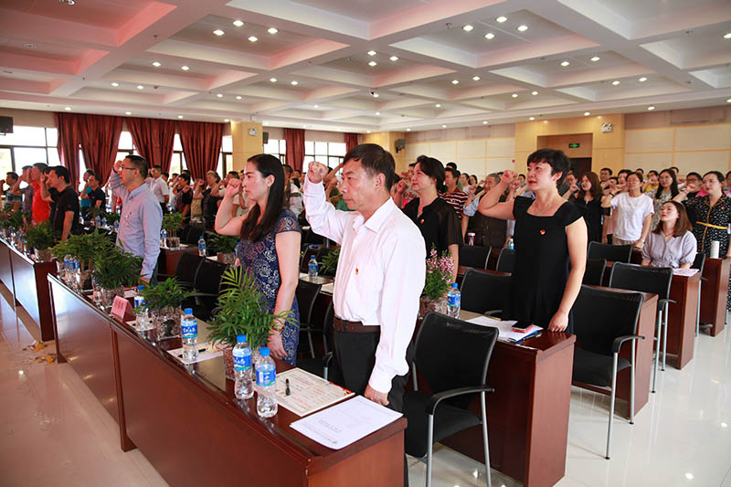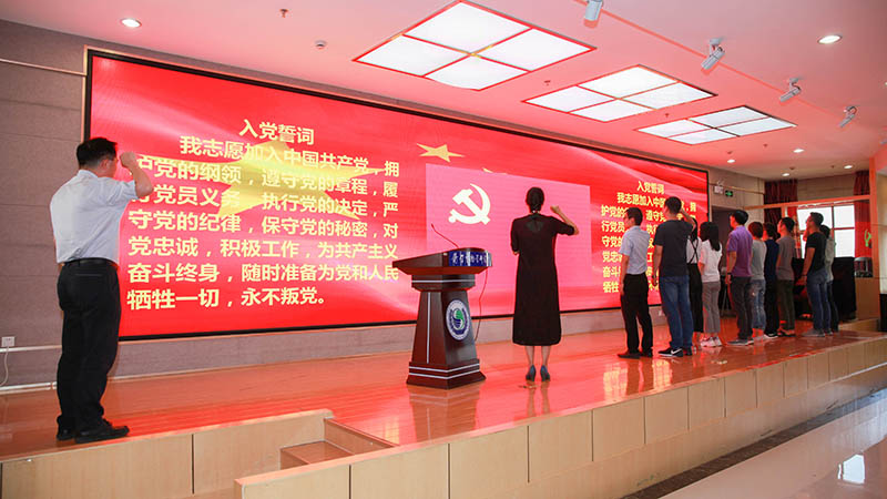 当日下午13点40分,大会在庄严的国歌声中拉开序幕。新党员面对党旗,紧握右拳进行入党宣誓,全体老党员同步重温入党誓词,铿锵有力的宣誓响彻整个会场。