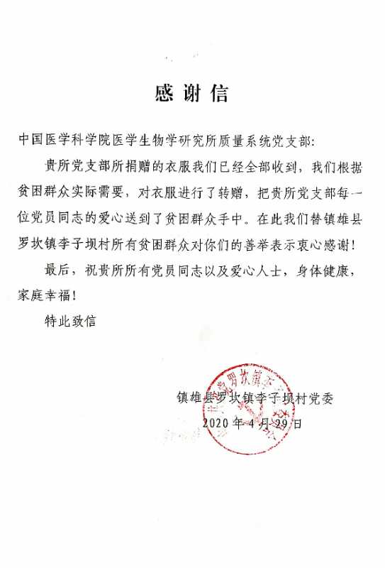2020年4月15日,中国医学科学院医学生物学研究所质量系统党支部组织全体党员及广大群众,对镇雄县罗坎镇李子坝村进行了一次衣物捐赠活动。广大党员及群众积极响应这次活动,纷纷献出自己的爱心。一件衣物送出一份温暖、一颗爱心带来一份感动,在我支部党员同志的共同努力下,对捐赠的衣物进行了规整、收纳、装箱,共计捐赠衣物13箱,并将其寄往李子坝村。