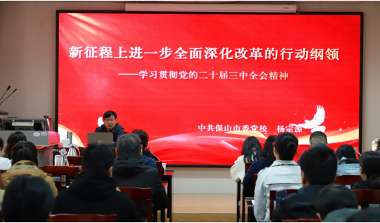 杨宗源副教授为学员们系统讲述了党的二十届三中全会精神,详细分析了新征程上全面深化改革的行动纲领。引导学员用党的创新理论武装头脑、指导实践、推动工作,把思想和行动统一到党的二十大和二十届三中全会的各项目标任务和党的决策部署上来,要深入理解改革的方向与目标,积极参与到改革实践中去,涵养专业精神,努力把自己培养成信念坚定、作风过硬的共产党员。