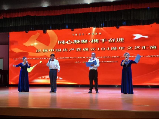 《再唱山歌给党听》《我爱你祖国》等红歌,不仅深情表达了党员群众对党的深厚情感,更极大激发了大家的爱国情怀和奋斗精神。此外,还有民族舞蹈、男女二重唱、多家单位联合朗诵等多种形式的原创节目轮番上演,每一个节目都洋溢着满满的正能量,生动展现了党员群众对党的无限忠诚与热爱。文艺汇演在全体党员群众齐声合唱《没有共产党就没有新中国》中圆满落幕。