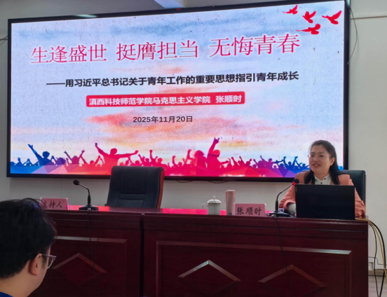 滇西科技师范学院讲师张顺时以“挺膺担当 无悔青春 —— 用习近平总书记关于青年工作重要思想指引青年成长”为主题授课,结合青年工作实际,解读新时代青年的使命与担当。