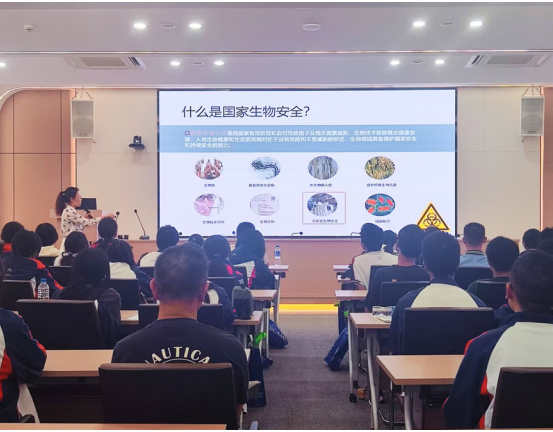 长期从事生物安全工作的李海燕老师作的“国之重器--高等级国家生物安全实验室”报告,通过视频、图文等介绍让学生对“国家高等级生物安全实验室”有了认识和了解,让年轻心灵震撼于科学研究的极度严谨,也深深感知国门生物安全屏障的厚重责任。
