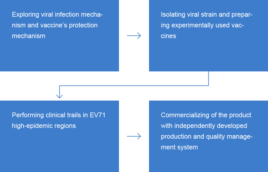 Utilizing domestic primate resources, IMBCAMS invented neonatal monkey model to explore pathogenic mechanism of EV-71 and to evaluate the efficacy of EntroVac?.Immune response mechanism induced by EntroVac? was studied in clinical trials. A multi-center phase III clinical trial involving 12,000 subjects at 6 to 71 months of age sufficiently proved the safety and efficacy of EntroVac?. Over two course of epidemic seasons, efficacy of the vaccine reached 97.3%