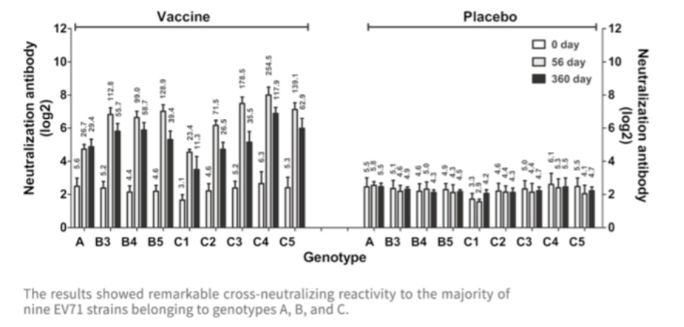 The EntroVac? developed by IMBCAMS is derived from the C4 subtype of EV-71, but the cross-neutralization test suggested that the vaccine could protect against most circulating EV-71 strains in different countries.