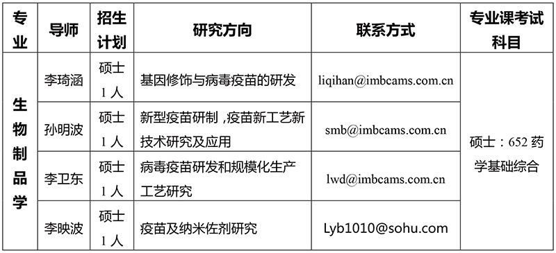 (一)生物制品学(硕士点):作为国内首个自主设置的学科,主要开展疫苗及生物工程、基因工程产品应用开发研究。培养新兴疫苗学、生物基因工程产品研究开发领域中具有理论基础、实践技能和有一定工作潜力的高级生物技术人才。