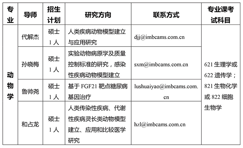 (七)动物学(硕士点):人类疾病动物模型建立研究(艾滋病、糖尿病、生殖、心血管等疾病);应用实验动物疾病模型,开展药物和疫苗的药效学、免疫原性、药代动力学和安全性评价等研究。
