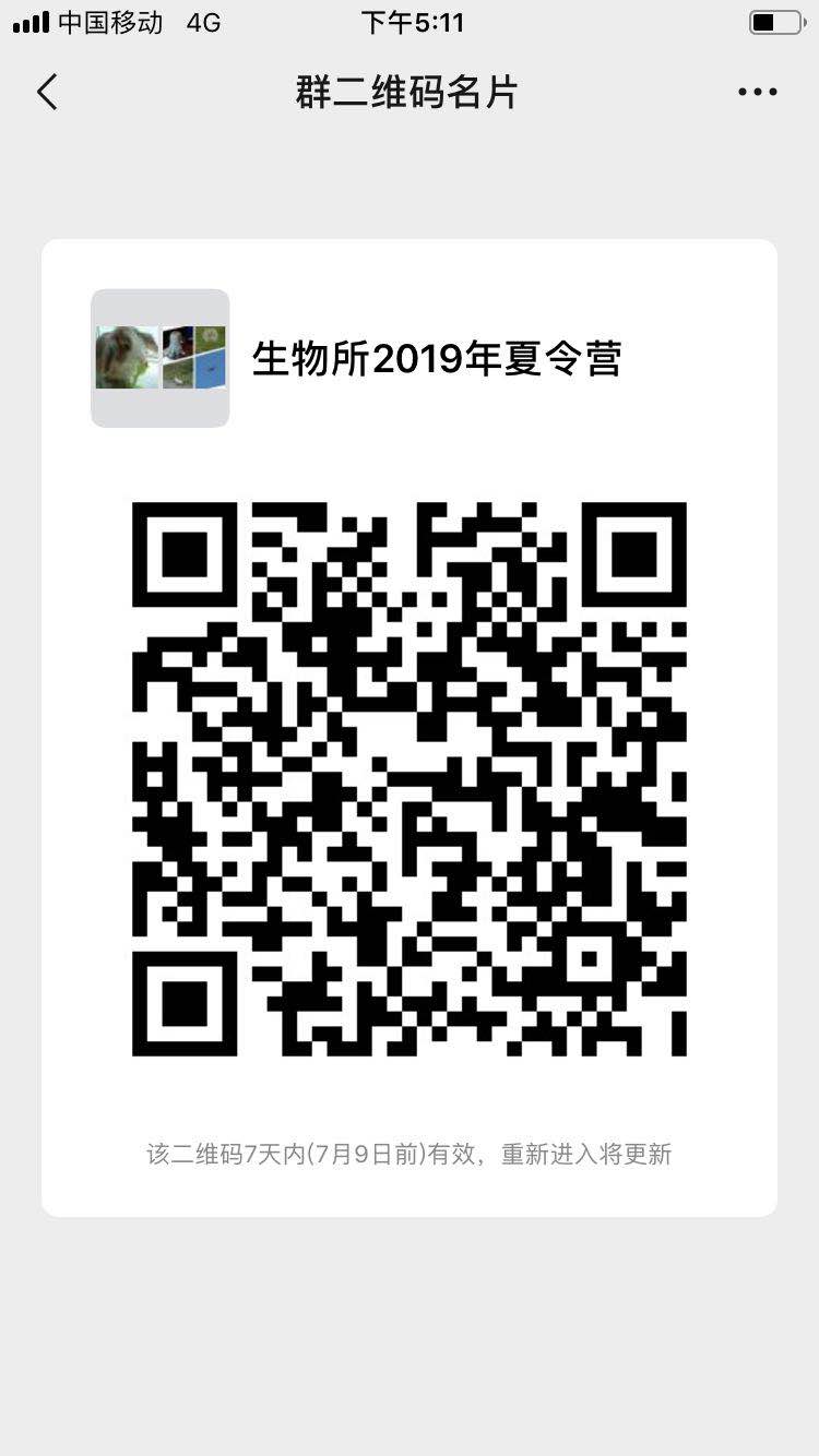 2、请所有录取同学在7月5日10点前加入微信群“生物所2019年夏令营”,我们将在群里公布夏令营具体活动安排,二维码如下:
