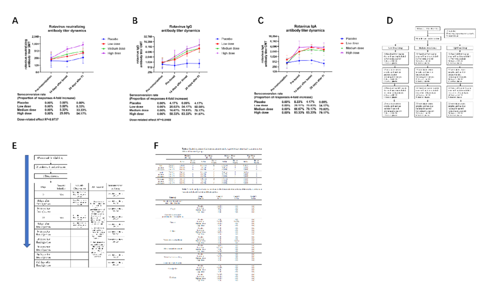 该试验采用随机、双盲、安慰剂对照设计。在本项研究中,96名青少年被随机分为三组(高剂量组、中剂量组和低剂量组),分别接种疫苗或安慰剂。受试者在每剂疫苗接种后接受30天的不良事件(AEs)监测,并在全程接种后对严重不良事件(SAEs)持续监测6个月。所有观察到的不良事件和严重不良事件均被记录。采用微量中和试验检测中和抗体的几何平均滴度(GMTs)和血清阳转率,并检测轮状病毒特异性IgA和IgG抗体水平。