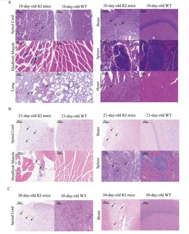 (A)10日龄小鼠在感染后第7天,脊髓及脑组织可见多量神经元细胞空泡变性以及神经元细胞坏死,细胞排列紊乱,伴多量小胶质细胞浸润,脑组织还观察到多量神经元固缩、深染,胞核胞质分界不清,嗜碱性增强,出现大面积水肿;而WT小鼠的脊髓组织仅可见少量神经元细胞空泡变性,脑组织可见神经元形态规则,未见明显异常;KI小鼠的肌肉组织可见局部小面积肌细胞坏死,肌纤维排列紊乱,伴大量淋巴细胞浸润,WT感染组小鼠未见明显异常。另外, KI小鼠肺组织观察到大面积肺泡以及支气管上皮细胞坏死,伴多量中性粒细胞浸润;脾脏组织中红髓可见大面积出血,伴多量中性粒细胞浸润;心脏组织观察到少量心肌细胞水样变性,胞质疏松淡染。而WT小鼠的同样组织仅受轻微影响或者未观察到明显变化。(B)21日龄KI小鼠脊髓、大脑、后肢肌肉、脾脏显示了与10日龄小鼠相似的病理特征,而WT小鼠的同样组织未观察到明显变化。(C)30日龄KI小鼠脊髓、大脑组织显示了与10及21日龄小鼠相似的相似病变。