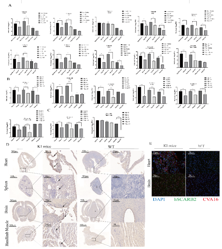 (A)在 10 日龄组(n=3),分别在感染后 5、7 和 10 天检测 KI 小鼠和 WT 小鼠的心、肝、脾、肺、肾、胃、肠、脑、后肢肌肉和足垫的病毒载量,并且感染后7天病毒载量达到了峰值,在心、肝及肺等组织中观察到病毒高表达情况。其中,心脏组织病毒载量高达1×107PFU,脑组织和下肢足垫(limb)中达到1×108PFU,后肢肌肉病毒复制最为明显,载量高达1×108.5PFU。(B)21日龄组(n=3),在感染后5天和7天,心、肝、肺、脑及下肢脚垫(limb)中观察到了高病毒载量。(C)30日龄组(n=3),较WT组,在感染中期(7天),病毒载量在脑组织以及下肢(limb)中观察到了显著性差异(图4C)。(D)30日龄组(n=3),在感染病毒后7天,取心脏、脾脏、下肢肌肉及脑组织进行IHC检测,其结果显示,在hSCARB2蛋白水平、mRNA水平达到峰值的组织中,CV-A16抗原的表达也是达到高峰(黑色箭头所示),而在WT小鼠中均未观察到或观察到少量病毒抗原。(E)使用免疫荧光检测10日龄组(n=3)KI小鼠体内病毒抗原与hSCARB2的分布情况。结果表明KI组小鼠在感染CVA16后第7天的心脏及脑组织存在hSCARB2蛋白和CVA16病毒抗原共定位现象。