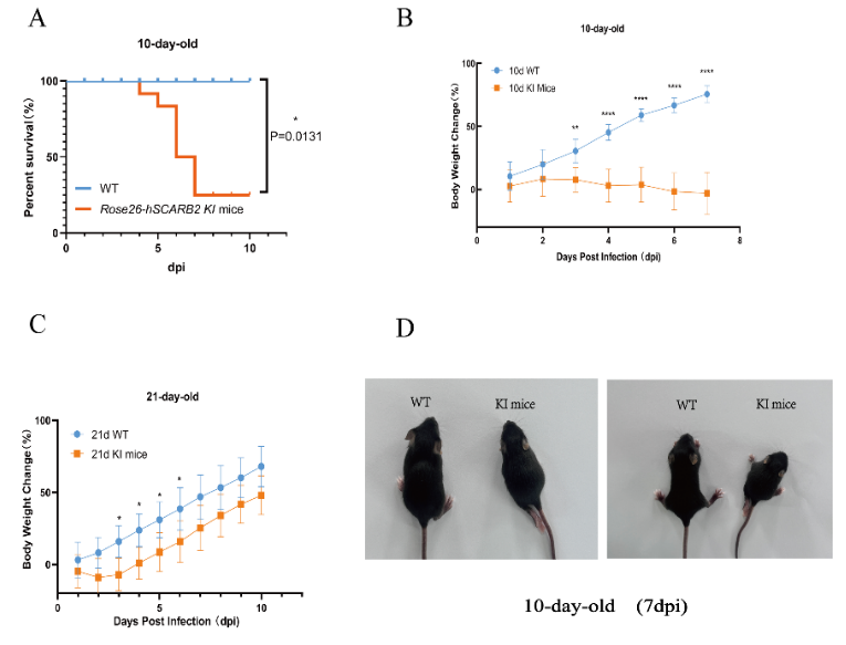 (A)10日龄KI小鼠和WT小鼠的存活率曲线,用对数秩检验分析KI小鼠和WT小鼠感染CVA16的存活率的统计学差异(*P=0.0131)。(B)使用双因素方差分析显示,与 WT 小鼠相比,KI小鼠的体重显著下降(****P < 0.0001,**P<0.01)。(C) 监测 21 日龄 KI 小鼠(n=7)和 WT 小鼠(n=7)感染 CVA16 后 10 天内的体重变化。使用双因素方差分析显示,与WT小鼠相比,KI小鼠的体重显著下降(*P < 0.05)。(D)在感染CVA16后10天的KI小鼠中观察到共济失调、活动减少和后肢瘫痪等临床症状,通常在感染后6-7 天出现。