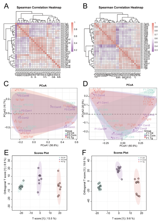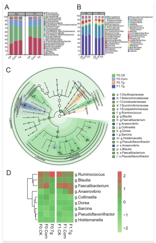 本研究通过为期7年的纵向实验,结合宏基因组学和代谢组学技术,系统评估了表达Cry1Ab/Cry2Aj和G10evo-EPSPS蛋白的转基因玉米对两代食蟹猴(F0和F1代)肠道微生物群及代谢物的影响。实验设计三组饮食:常规饲料对照(CK组)、70%非转基因玉米配方(玉米组)及70%转基因玉米配方(Tg组),涵盖26只F0代和30只F1代个体。通过分析物种组成、群落多样性及功能基因发现,转基因玉米长期摄入未显著改变肠道微生物的组成结构或功能特征;代谢组学虽检测到部分代谢物差异,但未与转基因玉米摄入直接关联。研究还验证了跨代稳定性,F1代肠道微生物群未因遗传或持续暴露出现异常偏移,表明转基因玉米在两代灵长类模型中均未引发肠道生态失衡。