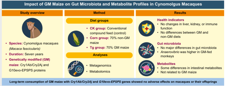 转基因作物自商业化以来种植规模迅速扩大,但其长期健康影响尤其是对肠道微生物组的跨代效应仍存在争议。作为全球主要粮食作物,转基因玉米通过引入抗虫(如cry1Ab/cry2Aj基因)和耐除草剂(如EPSPS基因)性状提升产量,但现有安全性评价多基于短期毒理学研究,缺乏对肠道微生物群这一关键健康指标的长期追踪。尽管肠道微生物组与宿主代谢、免疫等功能密切相关,且其紊乱可能导致肥胖、糖尿病等疾病,但现有研究多局限于啮齿类或家畜模型,结果存在不一致性(如Bt毒素片段残留争议)。非人灵长类动物(如食蟹猴)因与人类生理和肠道微生物发育高度相似,是更理想的转化医学模型,但针对转基因作物对灵长类肠道生态系统的多代影响研究仍属空白。