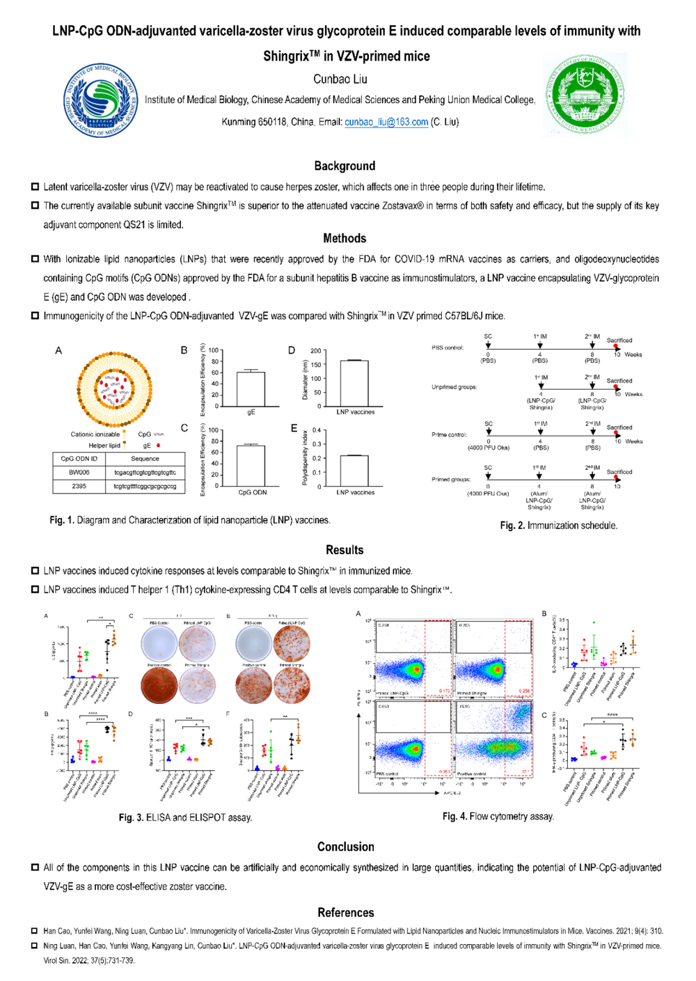 使用FDA最近批准用于COVID-19 mRNA疫苗的可电离脂质纳米颗粒(lipid nanoparticles, LNP)作为载体,以及2018年FDA批准用于乙型肝炎亚单位疫苗的富含GC的单链寡聚脱氧核苷酸片段(oligodeoxynucleotides containing CpG motifs, CpG ODN)作为免疫刺激剂,刘存宝研究团队开发了包裹VZV-糖蛋白E(VZV-gE)和CpG ODN的LNP疫苗,并在GSK公司用于其带状疱疹亚单位疫苗ShingrixTM临床前评价的VZV初免的C57BL/6J小鼠模型中评估了其免疫原性。LNP疫苗不仅诱导了与ShingrixTM相当的gE特异性IgG抗体水平,最重要的是,在用于ShingrixTM临床前评价的VZV初免的小鼠模型中,LNP疫苗诱导了与ShingrixTM相当水平的抗原特异性细胞免疫应答(cell-mediated immunity, CMI),而CMI对于带状疱疹疫苗的?;ばЧ鹁龆ㄐ宰饔?。