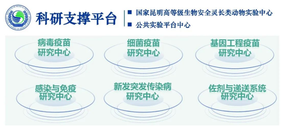 生物所对标国内外顶尖科研机构,集中整合研究力量,全力聚焦研究方向,以创新疫苗研发为导向,依托国家昆明高等级生物安全灵长类动物实验中心及所内公共实验平台中心,建立了病毒疫苗、细菌疫苗、基因工程疫苗、感染与免疫学、新发突发传染病和佐剂与递送系统的“六大研究中心”,搭建了创新疫苗研发平台和疫苗辅助技术平台。