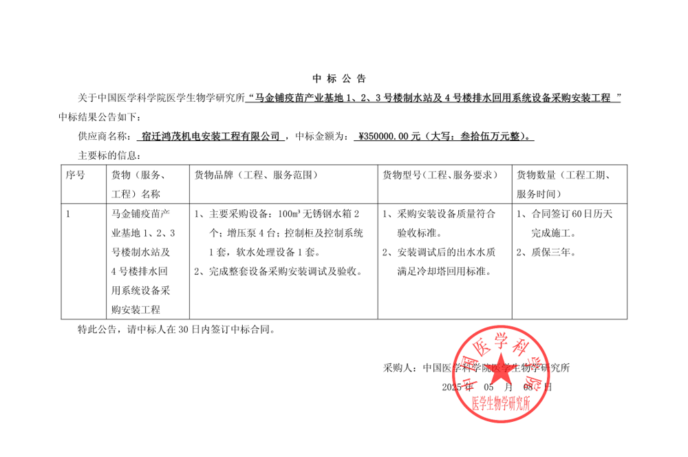 马金铺疫苗产业基地1、2、3号楼制水站及4号楼排水回用系统设备采购安装工程项目中标公告