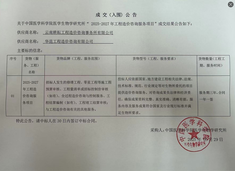“2025-2027年工程造价咨询服务项目”成交结果公告