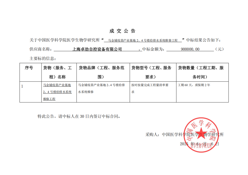 马金铺2.4号给排水系统改造成交结果公告