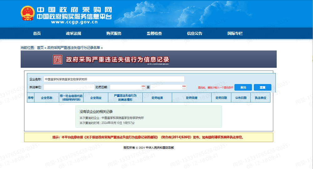 直接打印或网页截图打印下面“政府采购严重违法失信行为信息记录”图片(必须查询到如下页面):