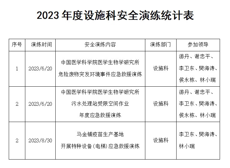 为贯彻落实所党委、所领导关于开展安全生产的重要部署,进一步提高设施科职工对于安全生产、隐患排查、应急处置的能力,全面从严、从细落实安全生产责任,中国医学科学院医学生物学研究所设施科在2023年初制定了“设施科年度安全生产教育培训计划及应急救援演练计划”,目的在于积极推动科室全体职工参与安全生产工作,筑牢职工安全生产意识。