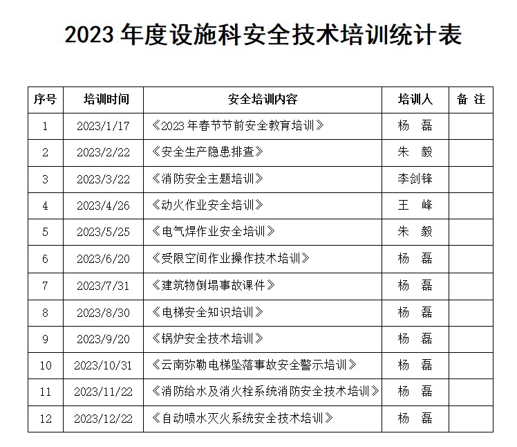 2023年度,设施处设施科结合日常工作,共开展安全技术培训12次,组织安全生产应急救援演练3次,实现了“天天讲安全,月月有培训,年年做演练”的既定目标。