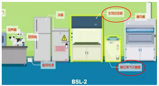 1)根据要求,生物安全柜和高压蒸汽灭菌器是BSL-2实验室的关键设备,也是BSL-1和BSL-2实验室的基本不同点。