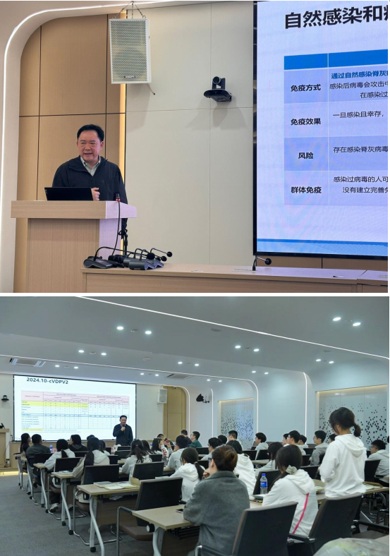 杨净思副所长作了《脊灰病毒学、免疫学及脊灰疫苗的研发史》的专题讲座,围绕脊灰疫苗的发展历史,中国实现无脊灰状态的历程,以及未来消灭脊髓灰质炎行动面临的挑战与展望,为同学们进行了详细介绍。他勉励同学们要铭记老一辈科学家的精神,努力学习专业知识,作为新时代的医学生,不断提升医学素养和实践能力,肩负起历史赋予的使命,为人类健康事业贡献自己的青春和力量。