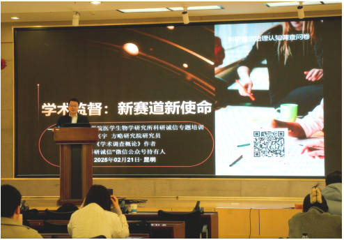 2025年2月21日,中国医学科学院医学生物学研究所(简称“生物所”)为积极贯彻国家关于科技自立自强和科研诚信是科技创新“生命线”的精神,开展科研诚信教育培训,特邀请北京大学哲学系侯兴宇教授,以“学术监督:新赛道新使命”为主题,为百余名师生、科研诚信委员和科技管理工作者带来一场兼具深度与启发性的科研诚信讲座。