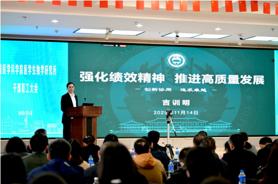 在生物所全体干部职工大会上,吉训明院校长作了题为“强化绩效精神推动高质量发展”的专题报告。他强调,生物所作为国家医学科技创新体系的“国家队”,必须牢固树立使命导向,将对国家“不可替代贡献”作为衡量工作的标准。他指出,科研工作的价值在于解决国家急需的卫生健康问题,产出实质性成果,而非仅以论文或经费为目标。面对当前挑战,吉训明呼吁增强危机意识与改革勇气。他要求,全面提升管理专业化水平,大力培养选拔年轻干部,并积极构建开放、坦诚、协作的组织文化,坚决摒弃“内耗”等不良风气。